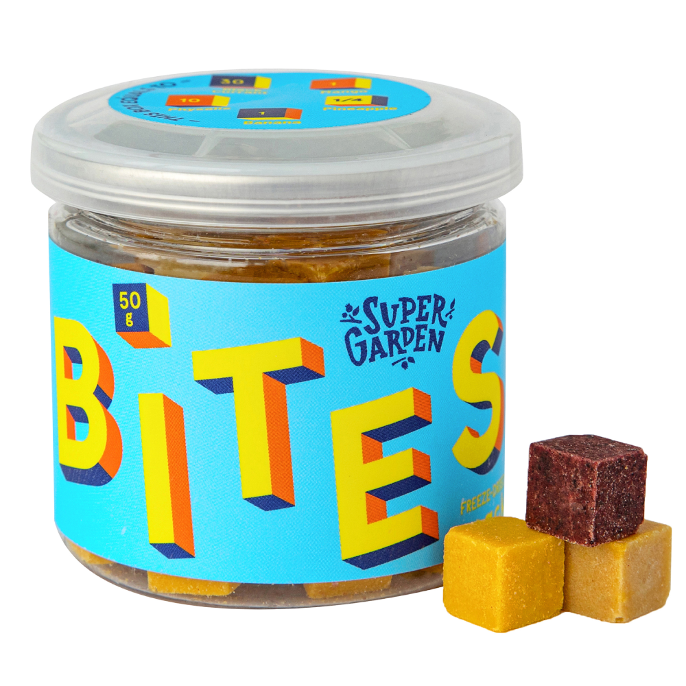 Ingredients: freeze-dried berries and fruits (pineapples, mangoes, bananas, currants, raspberries), cocoa butter, pea protein isolate.